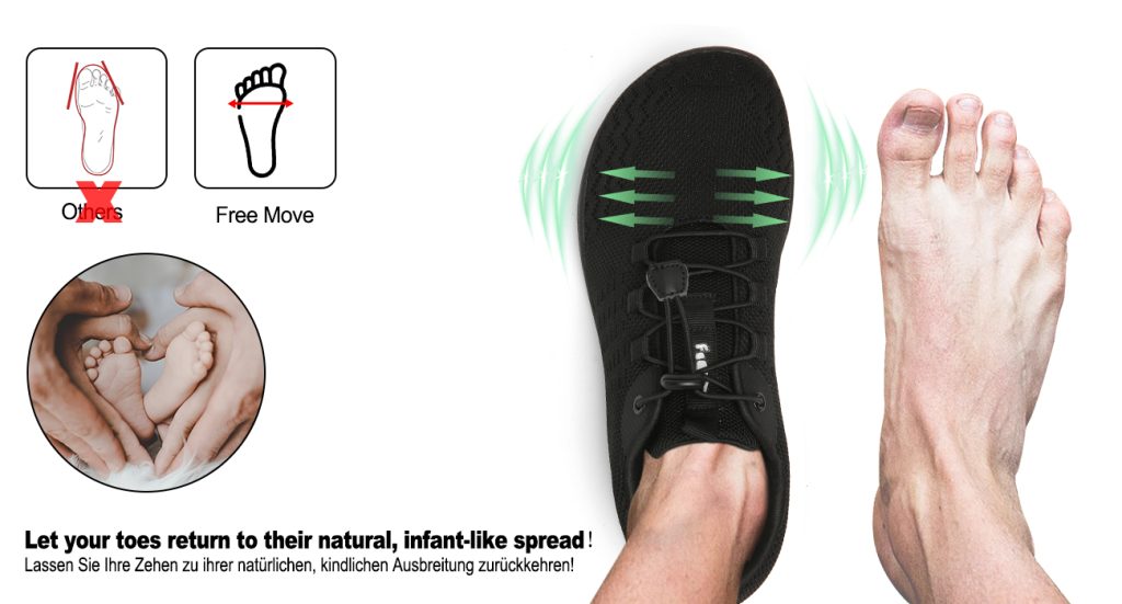 Extra Breiter Zehenbereich: Im Vergleich zu herkömmlichen Sportschuhen ist der Vorfußbereich der Geweo Barfußschuhe etwas breiter. Dieser extra breite Zehenbereich ermöglicht es Ihren Zehen, sich innerhalb des Schuhs frei zu bewegen und zu strecken, was eine authentische Barfußgehfahrung ermöglicht. Dies trägt zur Verbesserung der Gangart bei und fördert die Muskelkraft, das Gleichgewicht und die Haltung der Füße